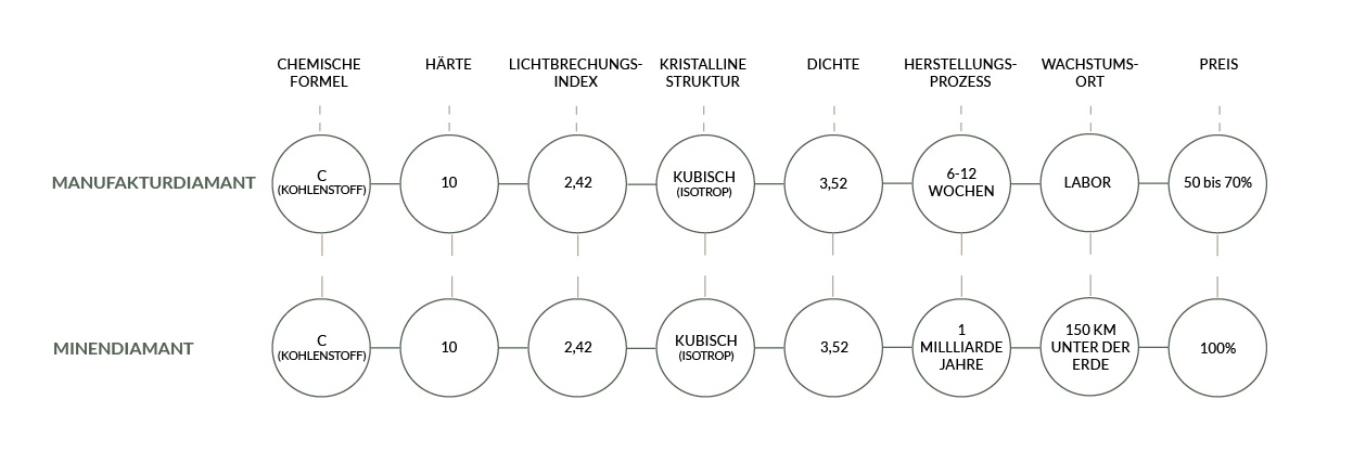 Das häufigste Missverständnis über MANUFAKTURDIAMANTs ist, dass es sich dabei nicht um echte Diamanten handelt. Das ist jedoch nicht der Fall. Sie sind genauso einzigartig und haben dieselben optischen, chemischen und physikalischen Eigenschaften wie Diamanten, die aus der Erde gewonnen werden. Nur ihre Herkunft unterscheidet sie voneinander.